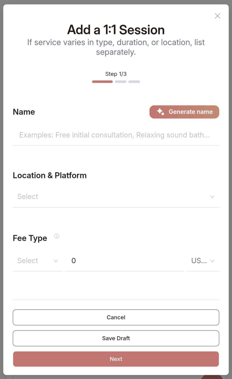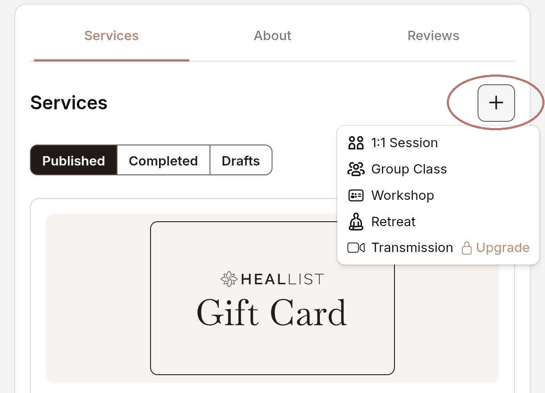 1. Click "Add Service" button from your Profile Page in Edit mode. You can choose from: 1:1 Session, Group Class, Workshop, and Empowered plan services such as Retreat and Transmission.