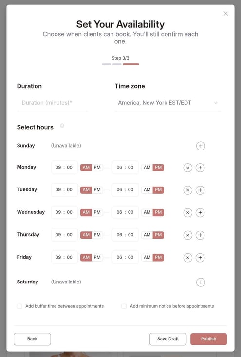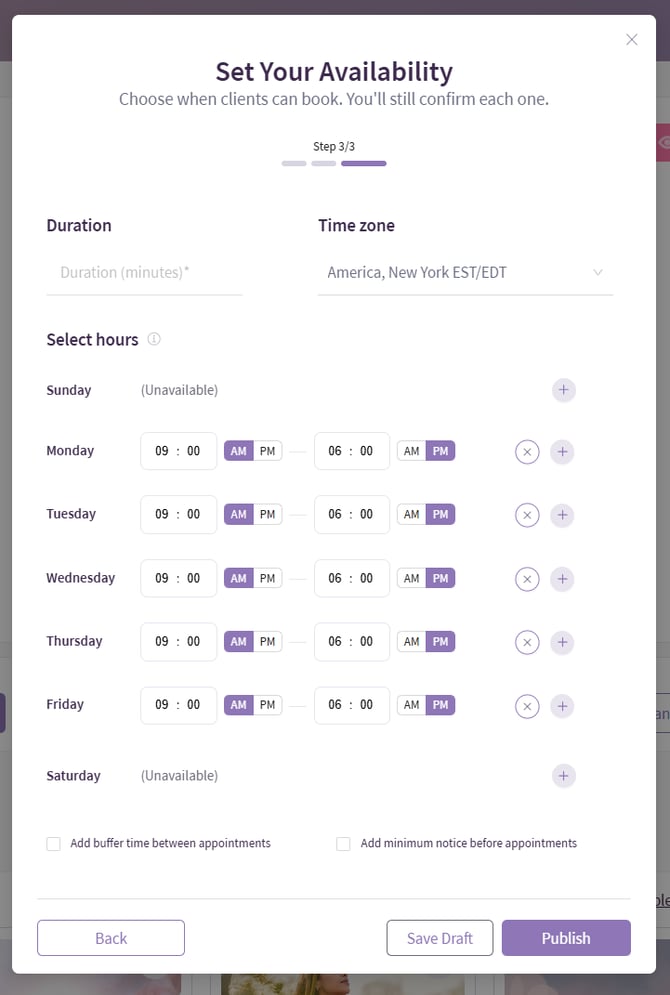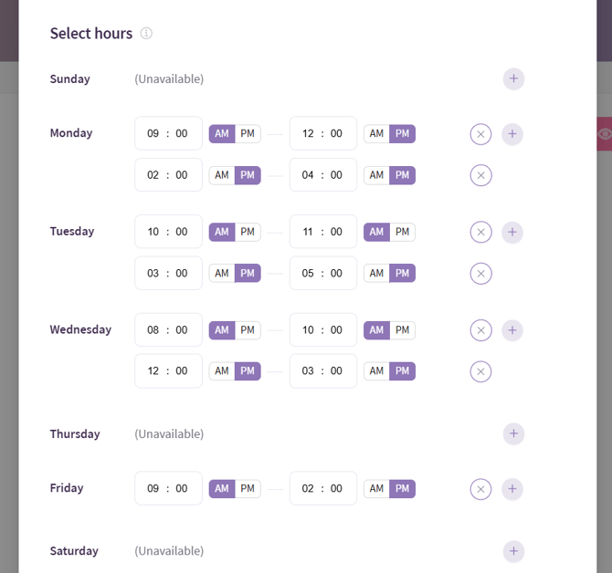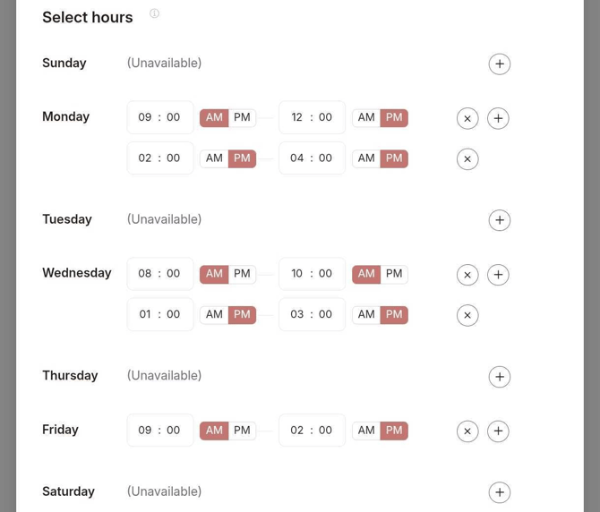 - Set your general availability window during which the clients can book your services. Select days of the week, Time zone, then Hours for each day. You can customize the hours by day, as well as add multiple availability slots for each day, for example 9-11am, 1-3pm, 6-8pm. To do so, simply keep changing the hours and clicking Add next to the day of the week.