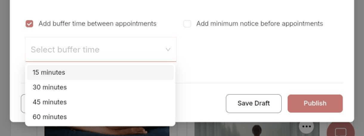 - Choose from predefined buffer options: 15, 30, 45, or 60 minutes.