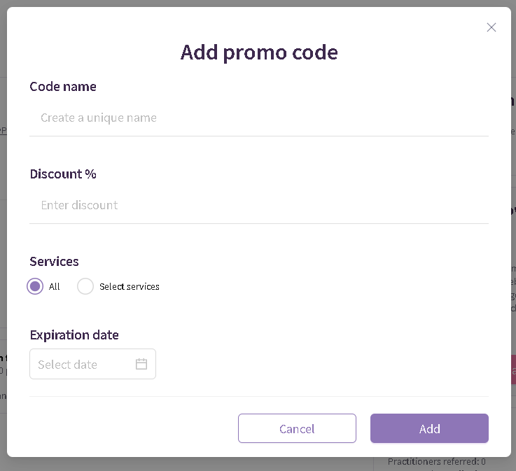 Q: Is there a limit to how many promo codes I can create? A: No, there is no limit. You can create as many promo codes as needed to support your practice’s promotional strategies.