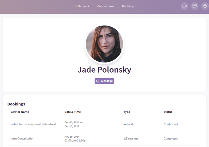 To access the history of all bookings for a particular client, find their name and/or profile picture in one of the following places: Connections tab -> My Clients OR their Booking Details screen. Once you click on their name, a new page will open with a list of all of their current and past bookings.
