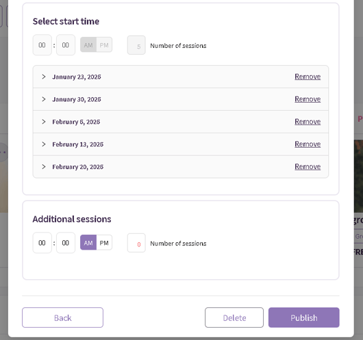 If you’re running an ongoing or multi-date group class, Heallist makes it easy to add additional session dates without creating a new service. This allows clients to continue booking the same class while keeping all sessions organized in one place.
