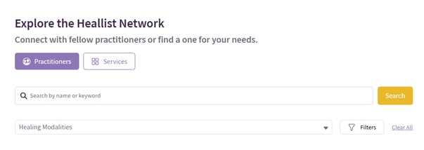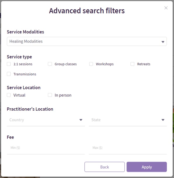 - Filter your search according to modality, service type, location of service (virtual or in-person), location of the practitioner, or the price range of the services in particular.