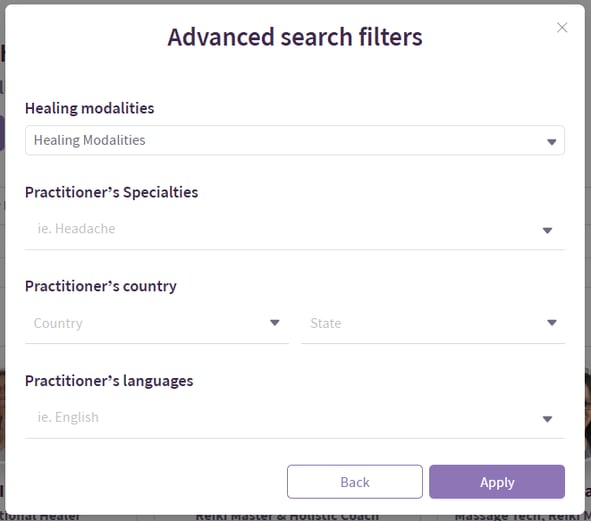 - Filter your search according to modality, specialties, country (and state if within the US), or languages spoken.