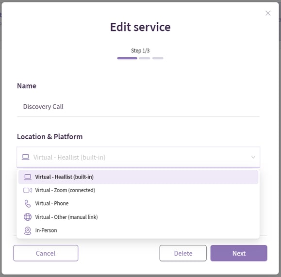 - Virtual: Select between Heallist (built in video calling app) and Zoom.
