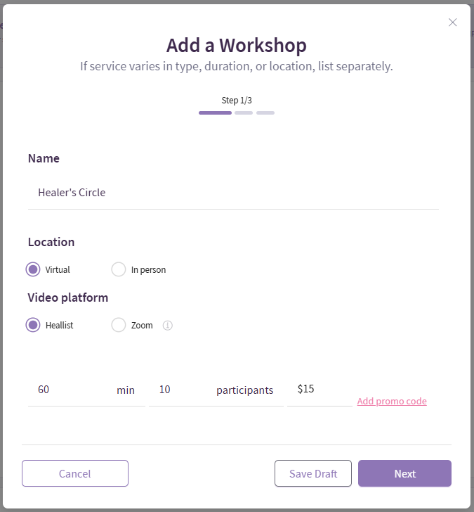 When adding or updating a service on Heallist, you can easily choose where and how your sessions will take place — whether virtually or in person. Here’s a step-by-step guide to help you set or update the Location and Platform for your services.