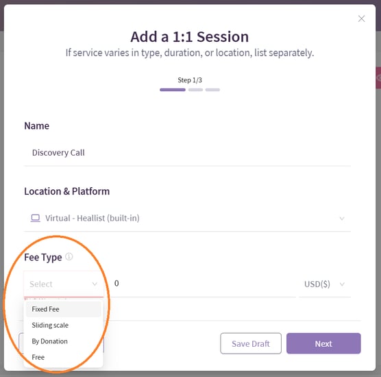 Heallist allows practitioners to customize how they charge for services by choosing from a variety of Fee Type options. This gives you flexibility in how you price your offerings, whether you prefer free, fixed rates, donation-based sessions, or sliding scale pricing.